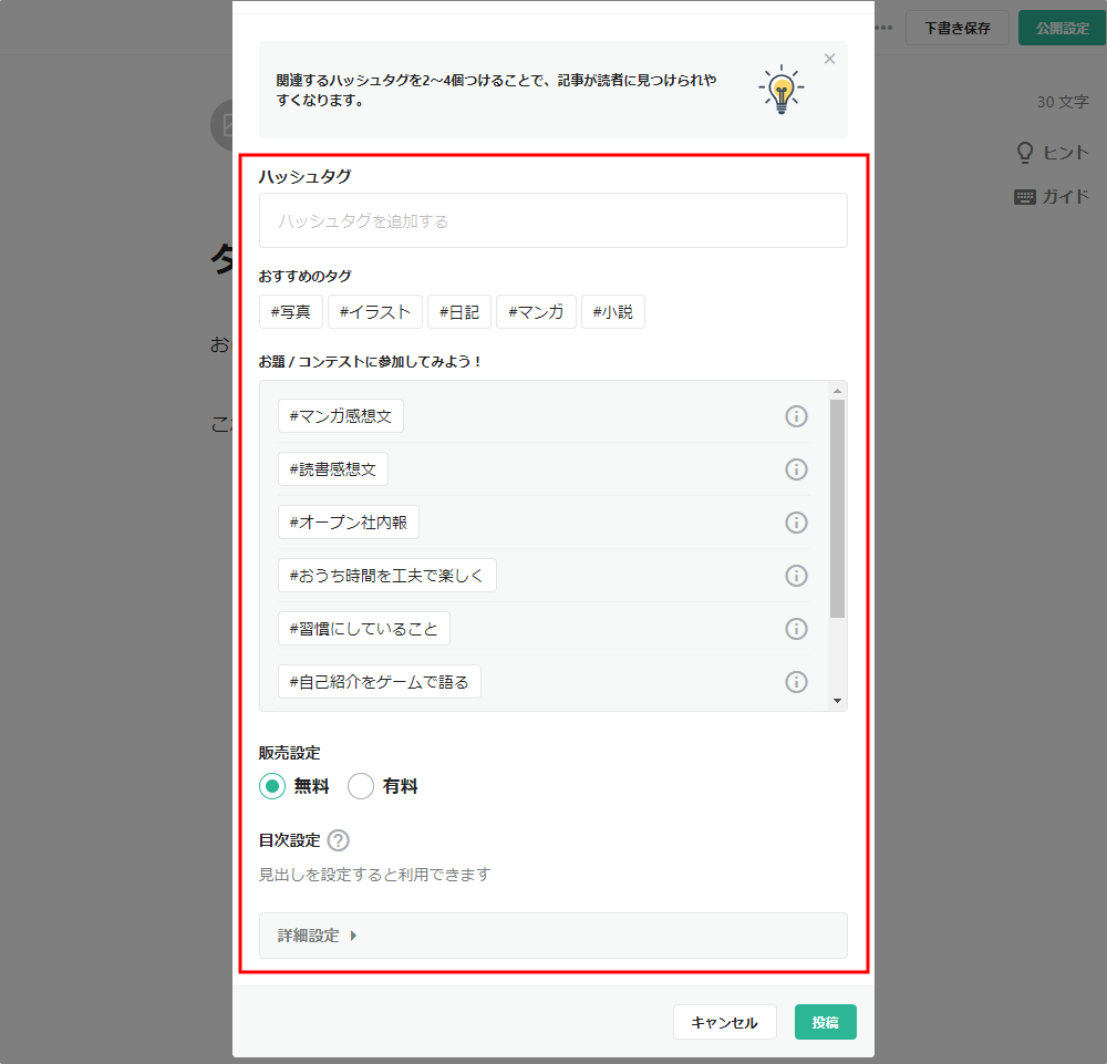 ⑤ハッシュタグやお題/コンテスト、販売設定、目次設定などさまざまな項目があるのでお好きな項目を選び、最後に右下の投稿を押します。