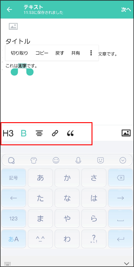 文字を長押ししてドラッグするとメニューが現れ、簡単な文字装飾ができます。以下それぞれの機能を左から順にご紹介します。