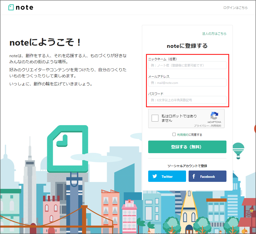 (下図下側にあるTwitterやFacebookアカウントでも登録できます。)
