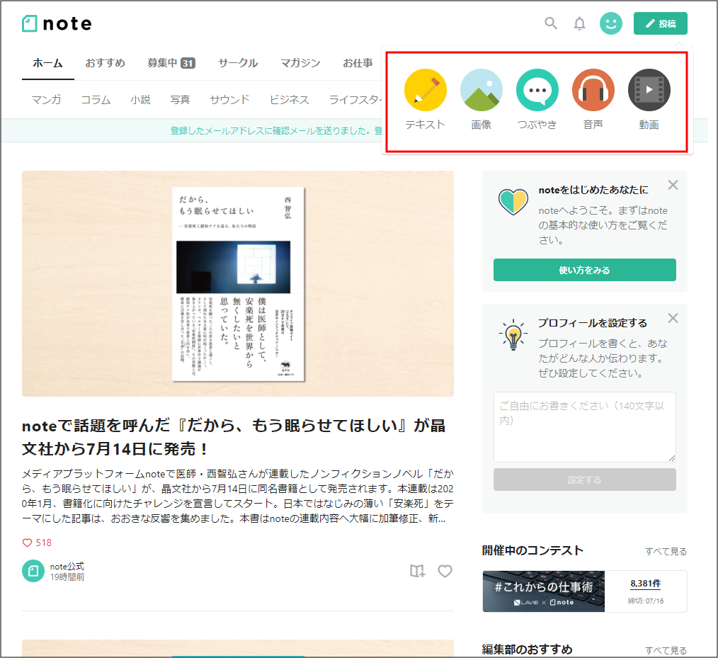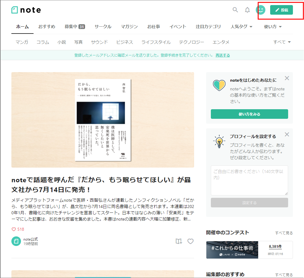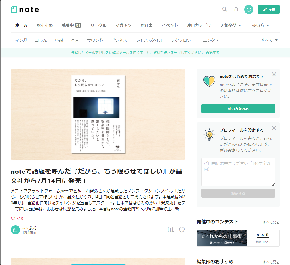 そのまま進めると、noteのトップ画面が表示されます。