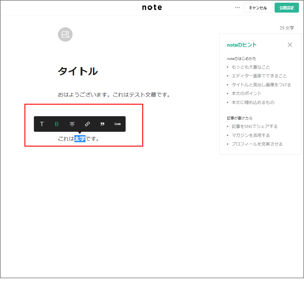 つぶやきを投稿することができます。noteというサービス名から投稿する文字数も多くないといけないと思われがちですが、SNSのような短いつぶやきを140文字まで画像を添えて発信することができます。