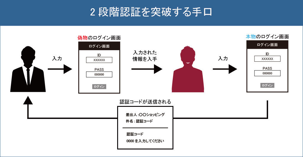 通常なら本物のログイン画面とユーザー間で直接やり取りする情報が、悪意をもった第三者による「偽物の画面」が間に入ることで、情報が筒抜けになってしまいます。