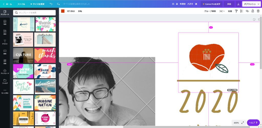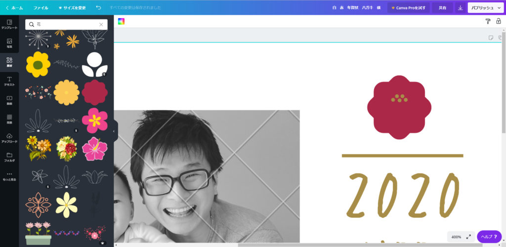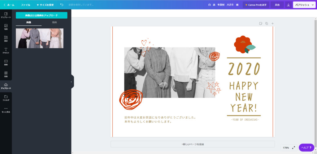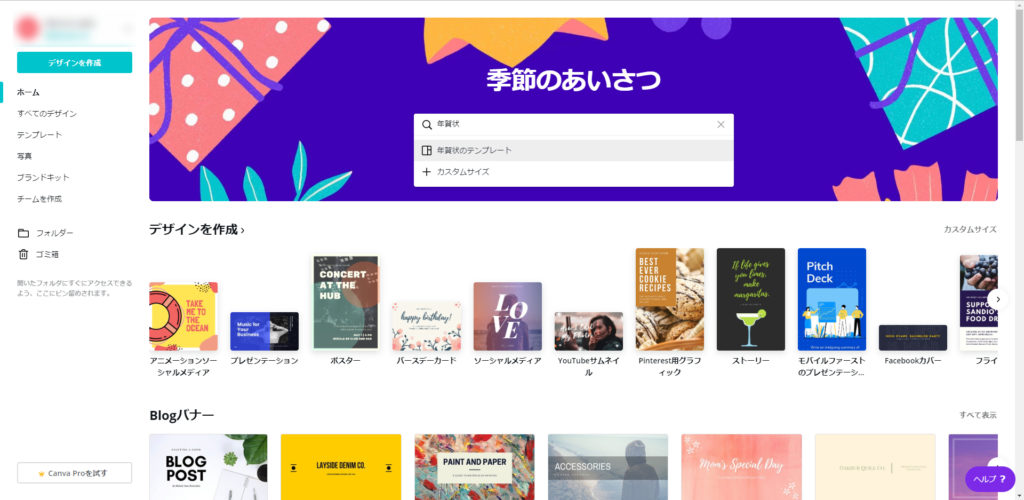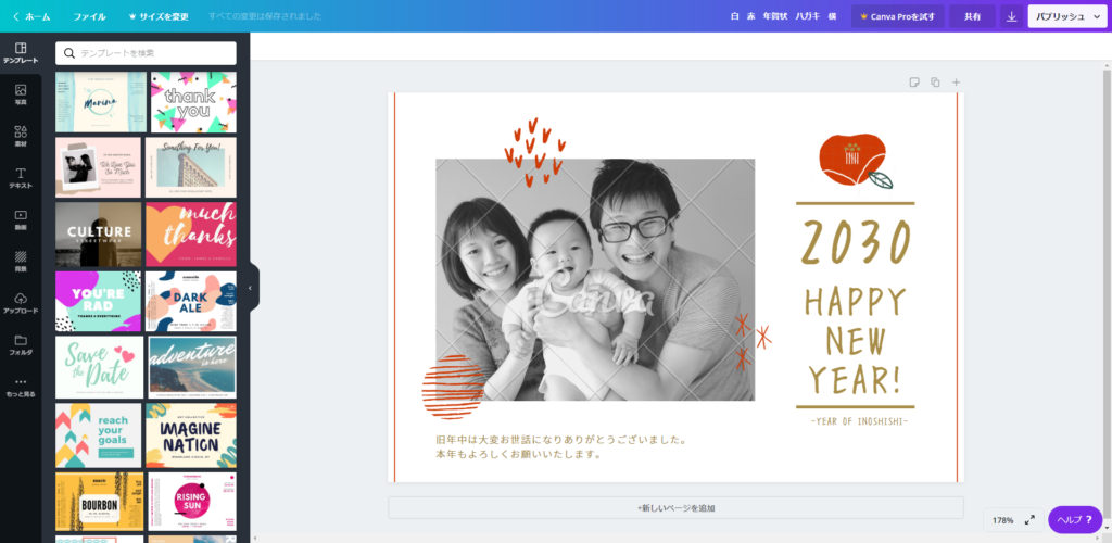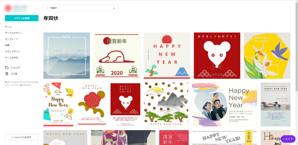 検索窓に「年賀状」と入力し、早速年賀状のテンプレートを見てみましょう!!!