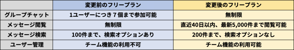 ちなみに、今回のフリープランにおけるサービス変更はグループ参加上限の撤廃がメインですが、他にもいくつかの変更点があるので、次の章から順番に紹介していきたいと思います。