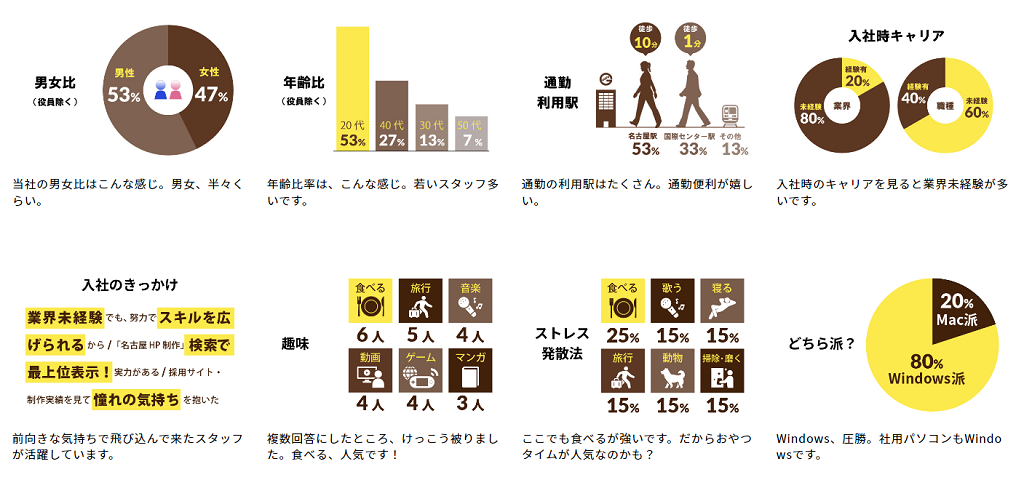 スタッフからアンケートを取り、その内容をグラフ化して「当社には、こんな方がこのくらい在籍しています」と、視覚的にわかりやすくアピールするのに効果的です。