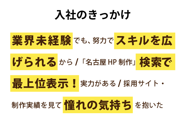 ちなみに、上の図には載っていませんが「入社のきっかけは、社名が気になったから」という意見もありました。「長い横文字の社名をたくさん見ていたので、アルファベット三文字なのがわかりやすかった」とのこと。