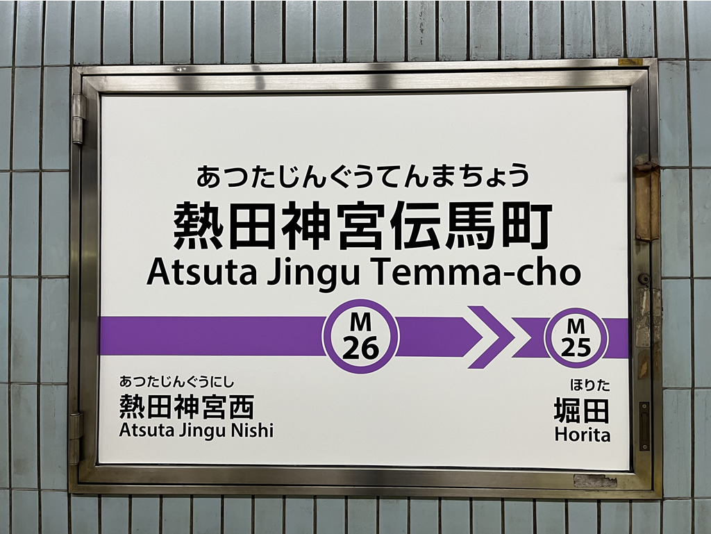 旧「伝馬町」駅、新「熱田神宮伝馬町」駅は名城線・名港線の駅で、新駅名から分かる通り熱田神宮の最寄り駅の一つです。