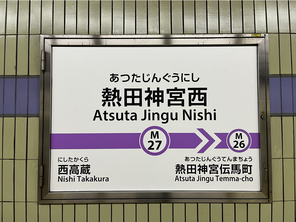 旧「神宮西」駅、新「熱田神宮西」駅は、名城線・名港線の駅です。熱田神宮の最寄り駅の一つで、今回の駅名変更で「神宮=熱田神宮」がよりわかりやすくなりました。