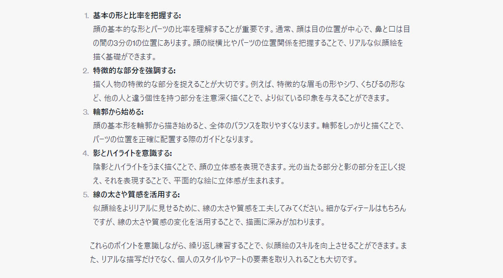 念のため、事前にチャットGPTに似顔絵を描くときのコツを聞いてみました。