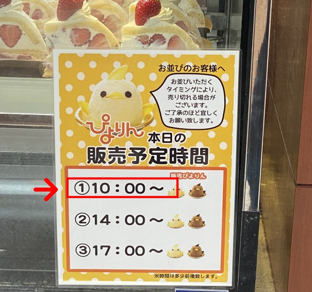 しかも販売予定時間が②14:00〜、③17:00〜とまだチャンスがあるように見えますが、お昼休憩の時間が13:00〜14:00なので、②は当然間に合いません。③についても、終業時間が19:00なので、仮にそこから駆け込んでも人気者のぴよりんはとっくに売り切れていることでしょう。