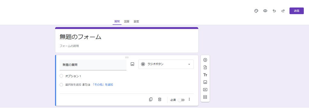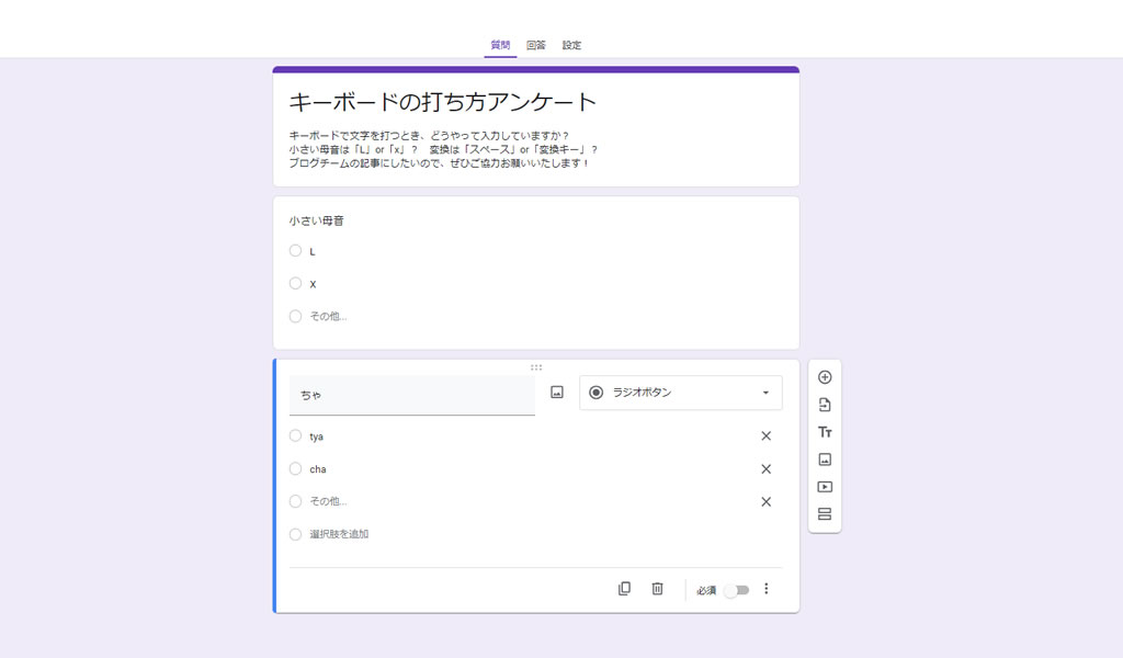 ここにフォーム名、フォームの説明、質問、質問の回答形式(ラジオボタン、プルダウン、記述など。今回はラジオボタン)をどんどん追加していきます。