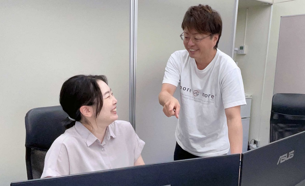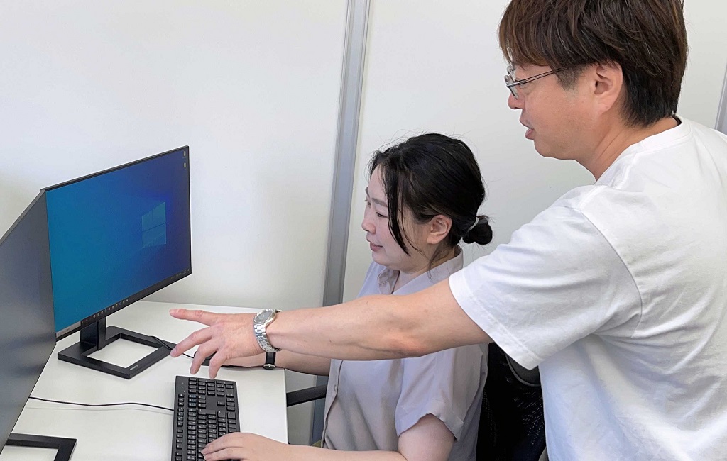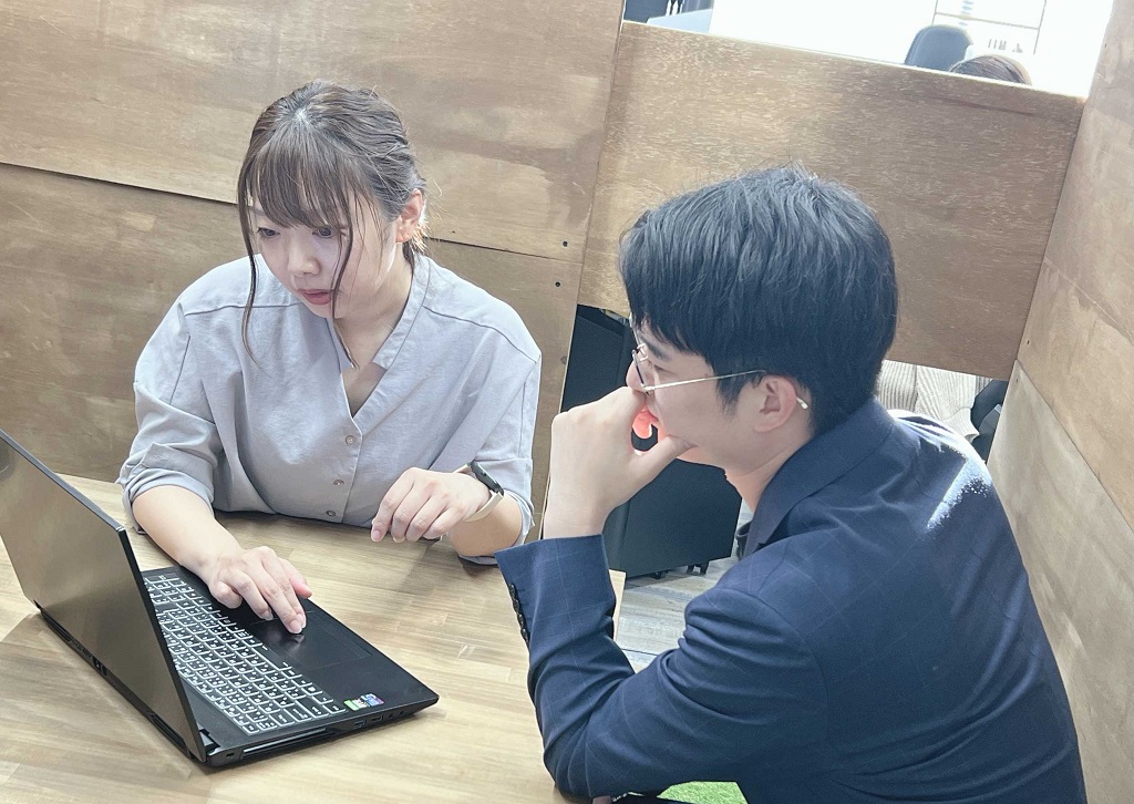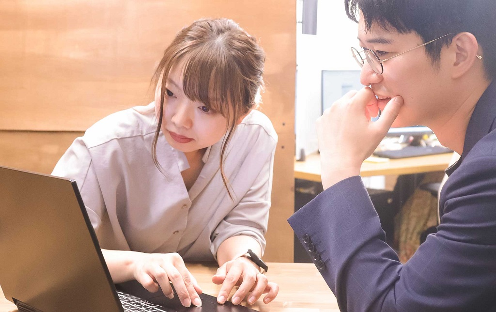 上司や先輩に仕事を教えてもらっている風のカットです。採用写真では定番!絶対欠かせないシチュエーションですね。楽しそうにお仕事をしている様子、真剣に画面を見ている様子が伝わってきます。