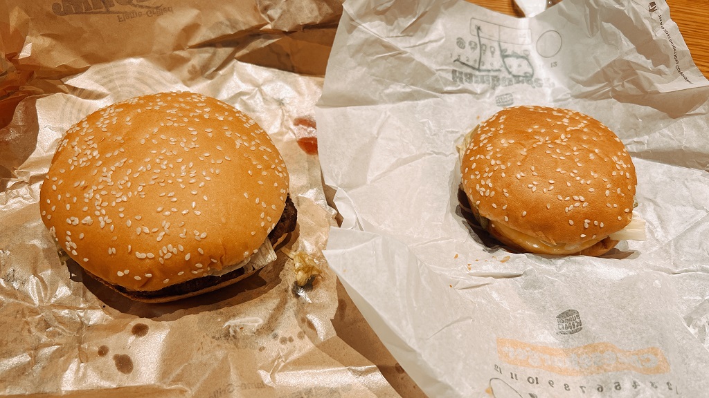 マクドナルドと比べれば若干あっさりめです。ただ、あくまで「マクドナルドと比べたら」なので、十分美味しくて食べ応えがありますね。