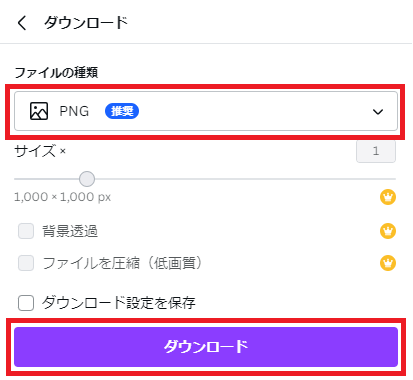 基本的には、推奨されている「PNG」を選んでおけばOKです。下部の「ダウンロード」ボタンを押せば、所定のフォルダに保存されます。