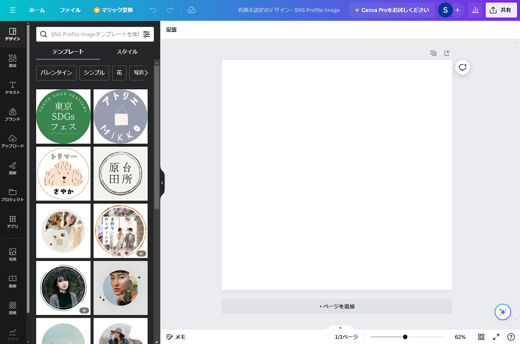「カスタムサイズ」で大きさを指定してもいいですが、今回は「アイコン」と検索して、汎用性の高そうな「SNSアイコン(正方形)」を選びました。