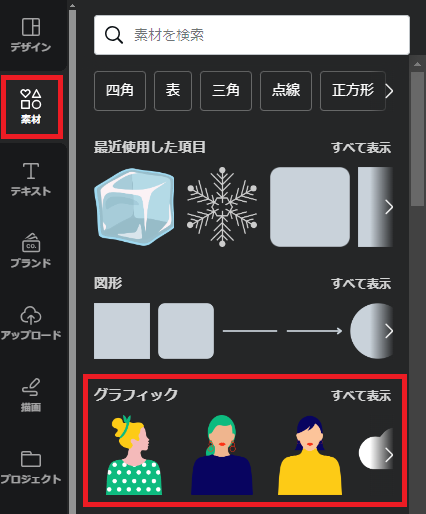 左側の「素材」タブを押して、「グラフィック」→「すべて表示」を押すと、同じ作者さんの違うイラストがいくつか表示されました。こうやって自動で表示してもらえるところ、かゆいところに手が届く感じがしてとてもありがたいです!