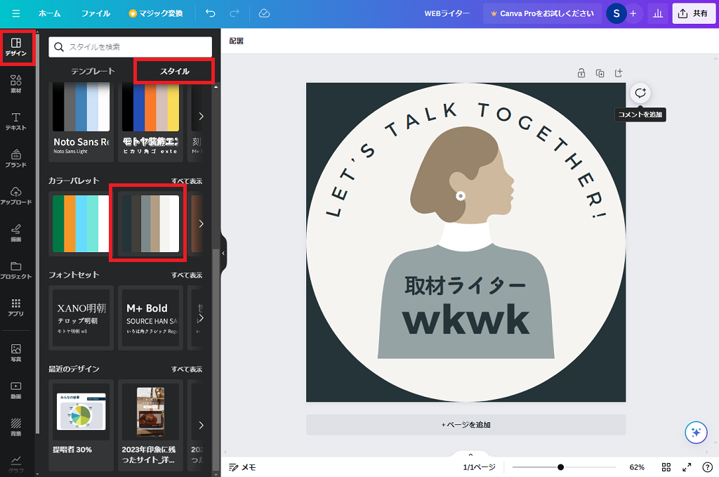 「使う色のセンスに自信がないな…」という方は、「デザイン」→「スタイル」で好きなカラーパレットを選ぶと、自動的にバランスのよい配色に変更してくれます。同じカラーパレットを何度も押すと、配色される場所がランダムで変わるので、お気に入りの組み合わせができるまでチャレンジしても楽しそうですね。