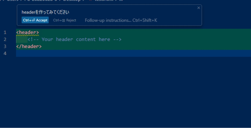 ファイル上でショートカットキーのctrl + Kを押して指示を出せばコードを自動生成してくれます。