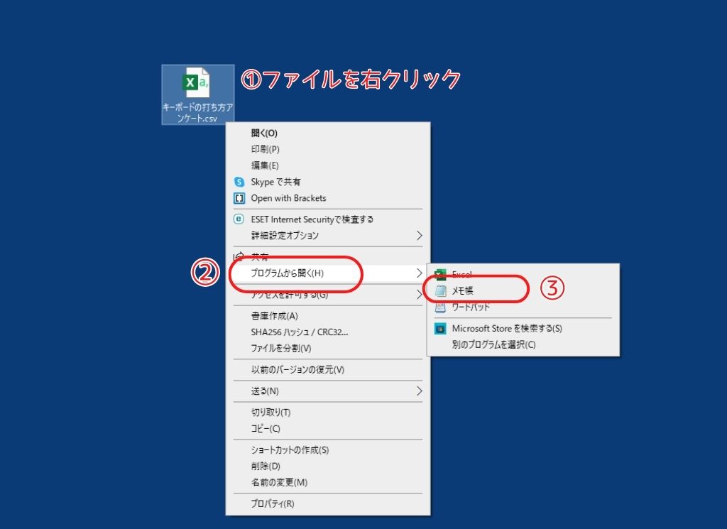 表示されたメニューの中にある「プログラムから開く」をクリックし(上記画像②)、更に表示されたメニュー内の「メモ帳」をクリックします。(上記画像③)