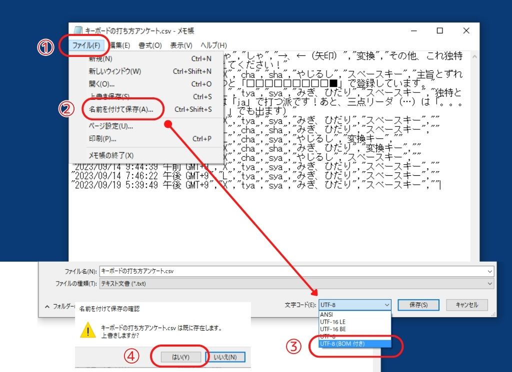 保存場所とファイル名はそのままで、画面の一番下にある「文字コード」の部分を「UTF-8(BOM付き)」に変更し(上記画像③)、上書きの確認ポップアップで「はい」を選択します。(上記画像④)