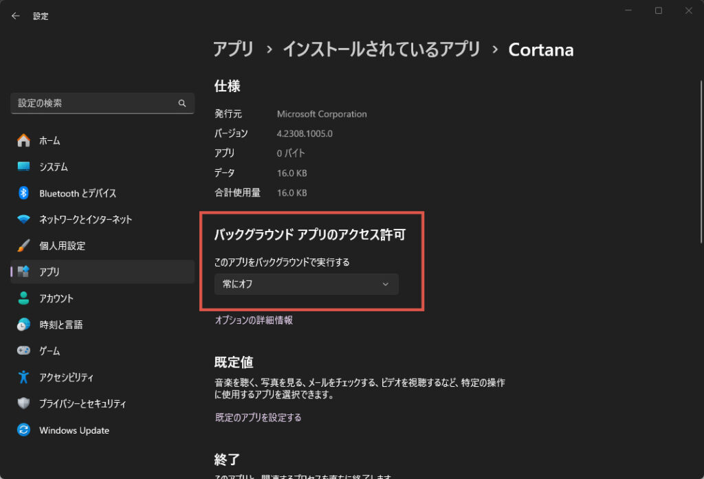 設定画面からバックグラウンドアプリの実行を「常にオフ」できます(画像はWindows 11の場合)
