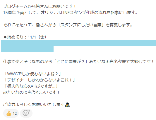 WWGは15周年を迎えます! ~記念企画準備編~)そして今回、タイトルのとおり「オリジナルLINEスタンプ」を作ります!