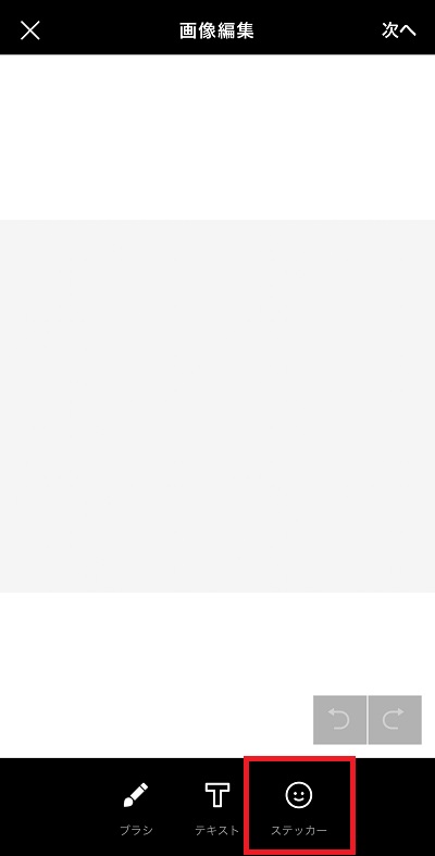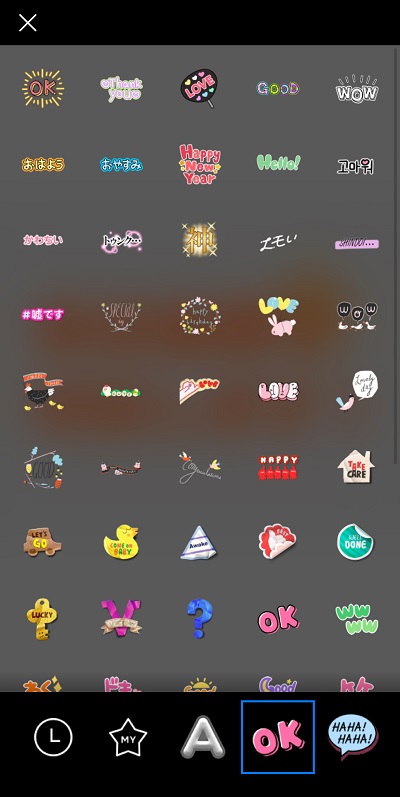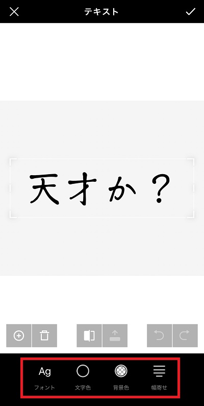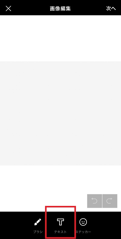 今回はおもしろワードが満載だったので、文字だけのスタンプがあっても楽しそう!というわけで、画面下の中央にある「テキスト」を押します。