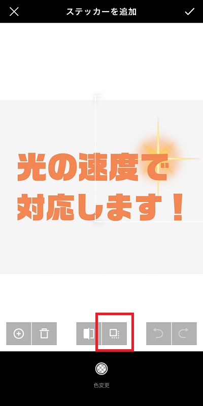 真ん中あたりにある四角が重なっているマークを押すと、選択中の素材や文字の重ね順が変わります。「これは文字の下に置きたいんだよな~!」というときに便利です。