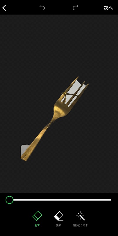 だいぶ雑でしたが、けっこういい感じに切り抜けました!黒い部分が削除されて、フォークだけが残ります。細かい部分を調整しましょう。