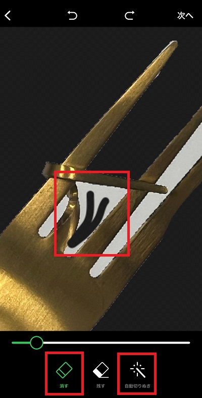 切り抜きたい!という部分に、「消す」を選んだ状態で適当に線を引きます。そのまま右下の「自動切り抜き」を押すと…。