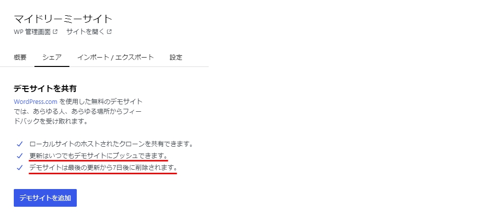 - デモサイトがアクティブの状態にしていなくても他のユーザーに共有できること
