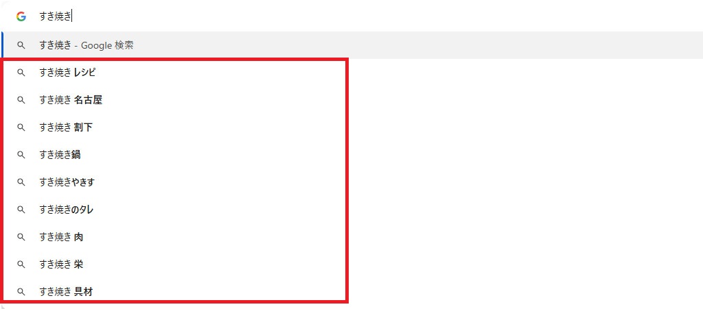 画像のサジェストは社内のパソコンで表示されたものですが、WWGは名古屋にあるので「すき焼き 名古屋」という現在地を反映したキーワードがありますね。