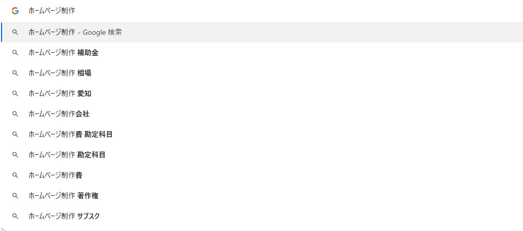 なので、ホームページ制作関連のサジェストを見ながらその検索意図を想像し、それに応えるブログネタを見つけることを今回の最終目的とします。