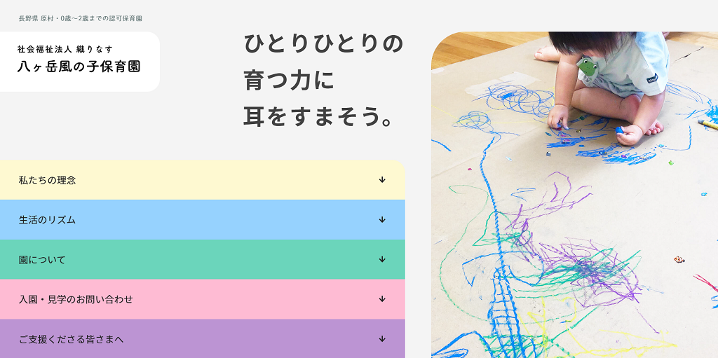 八ヶ岳風の子保育園様。長野県にある認可保育園のホームページです。これから自分の子どもを預けようか検討している保護者の方がメインターゲットかなと思います。