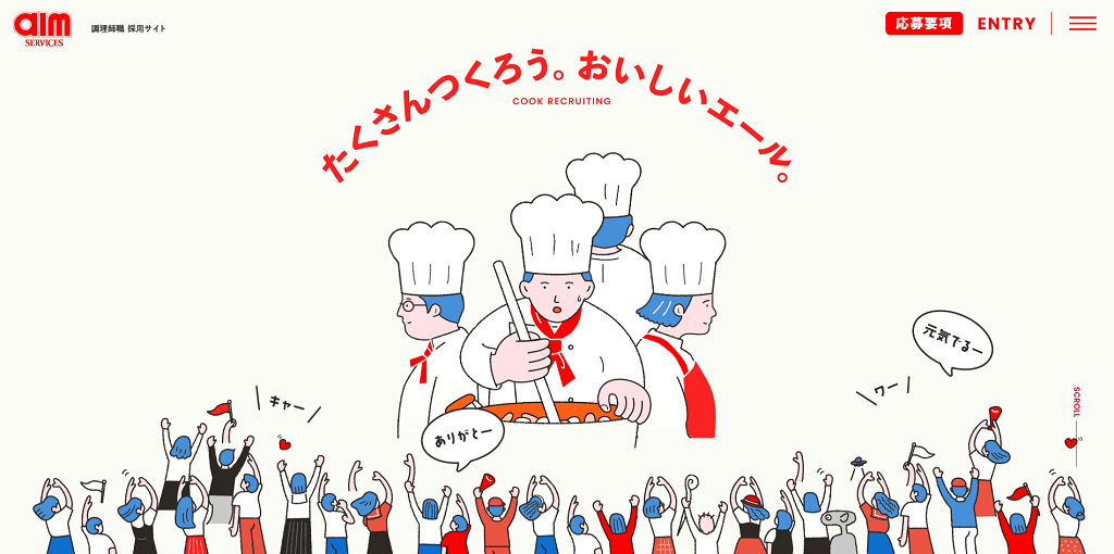 エームサービス様、調理師の新卒募集サイトです。工場や病院、学校などの施設に提供する食事をつくるお仕事ですね。
