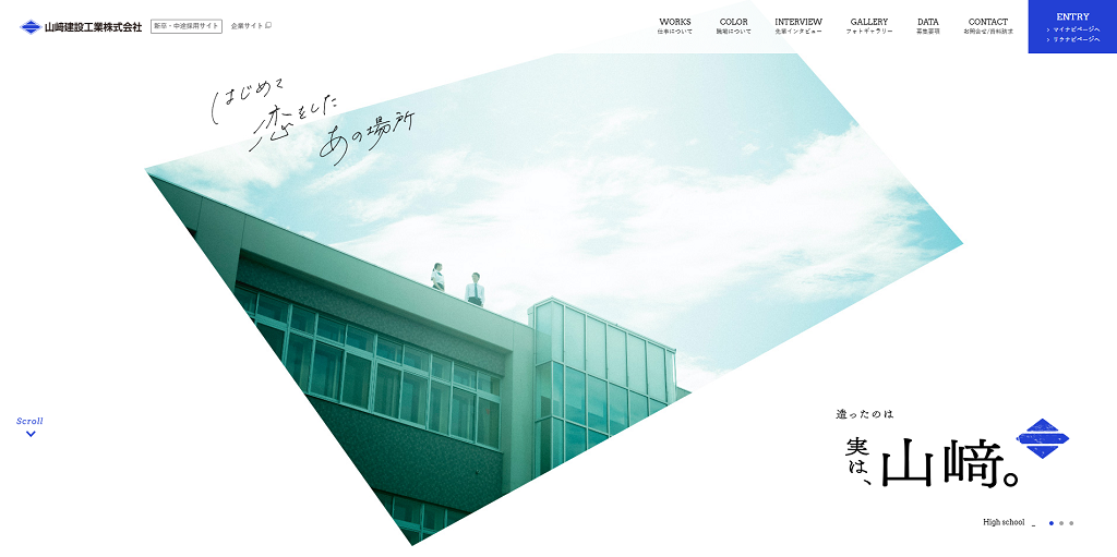 「はじめて恋をしたあの場所」という手書きのメッセージとともにあらわれる、学校の屋上と男女の学生。そして「造ったのは 実は、山崎。」のコピー。「さまざまな人の思い出の場所を、私たちが作っている」ということですね。