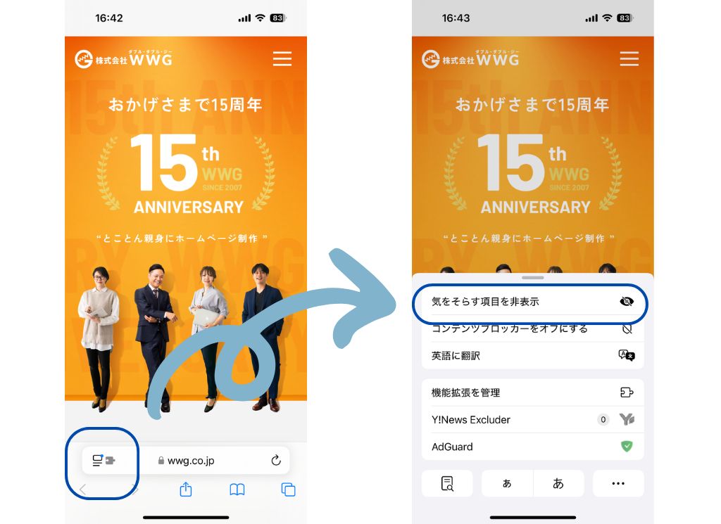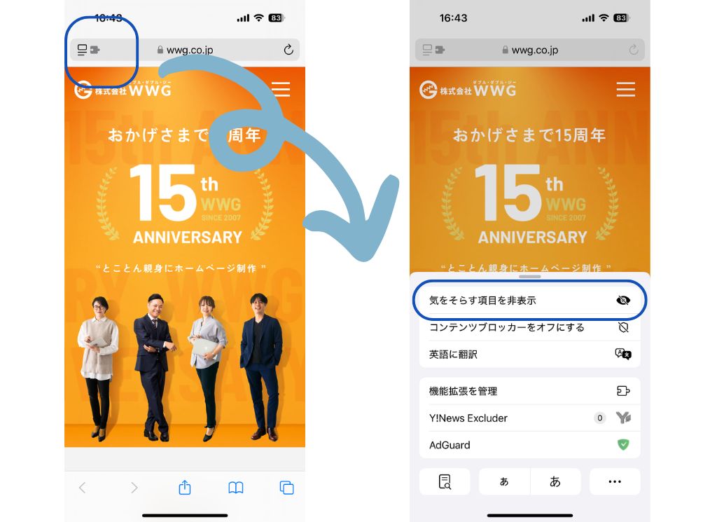 使用方法はシンプルで、URLバーのメニューから「気をそらす項目を非表示」を選択し、非表示にしたい部分をタップするだけ!