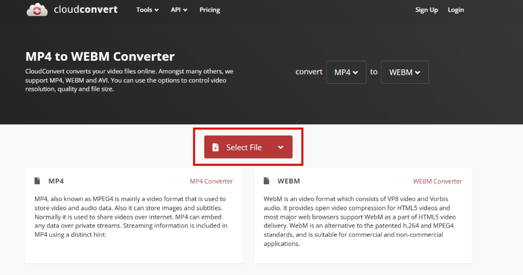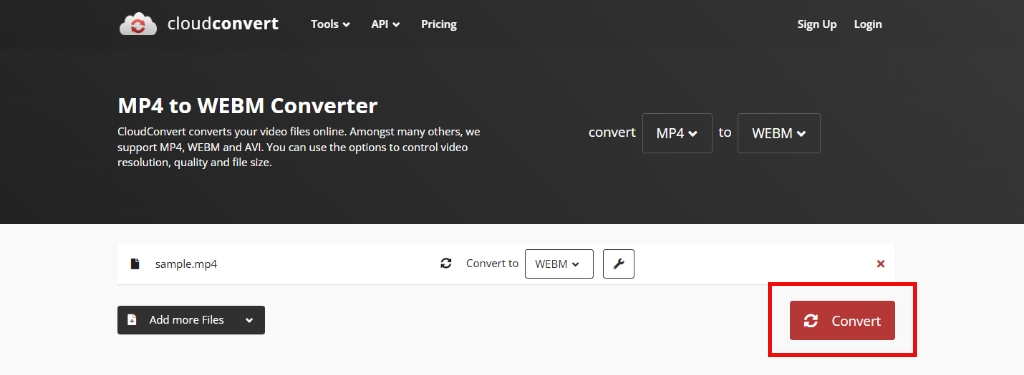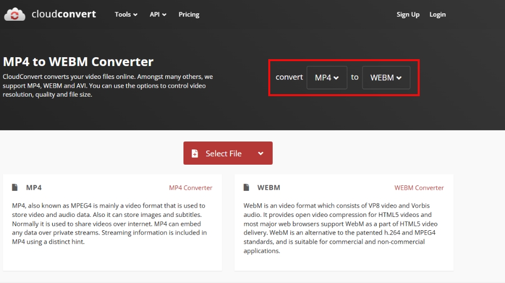 まずは赤枠で囲った『Convert』の部分が変換したい拡張子(MP4やMOVなど)からWEBMに変換されるようにセレクトボックスから選んで設定します。
