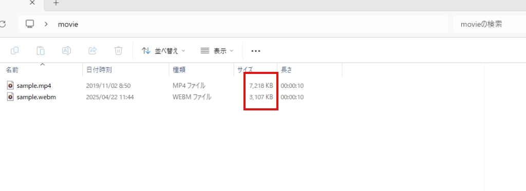 容量がどのくらい変わったか確認してみましょう。上がmp4で下がWebMです。なんと半分以下ですね!これは使わない手はありません。