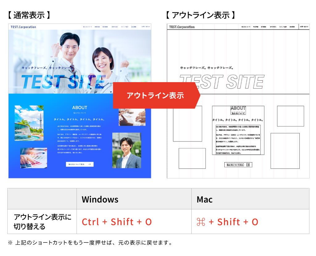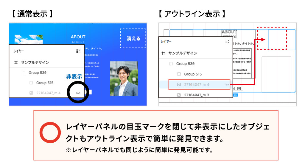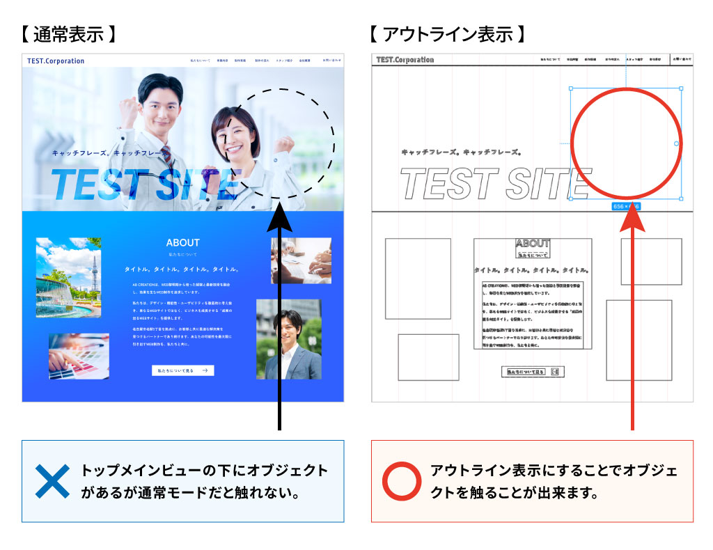 通常モードでは、上に重なった要素に邪魔されて、下のオブジェクトを選択するのが難しいことがあります。アウトライン表示ならすべてのオブジェクトが輪郭で表示されるため、階層の深いレイヤーも直接選択しやすくなります。