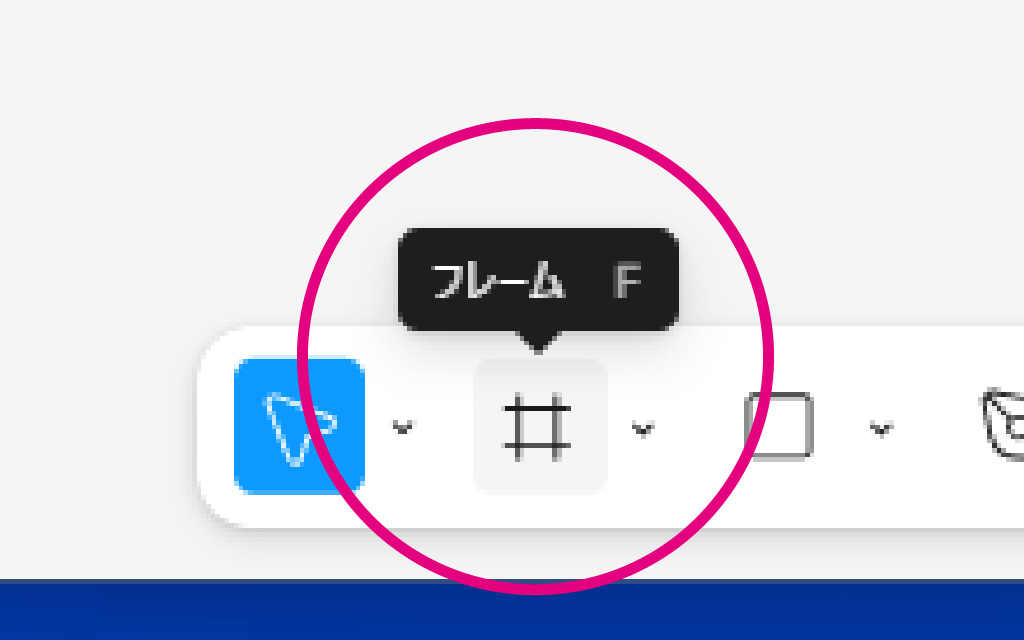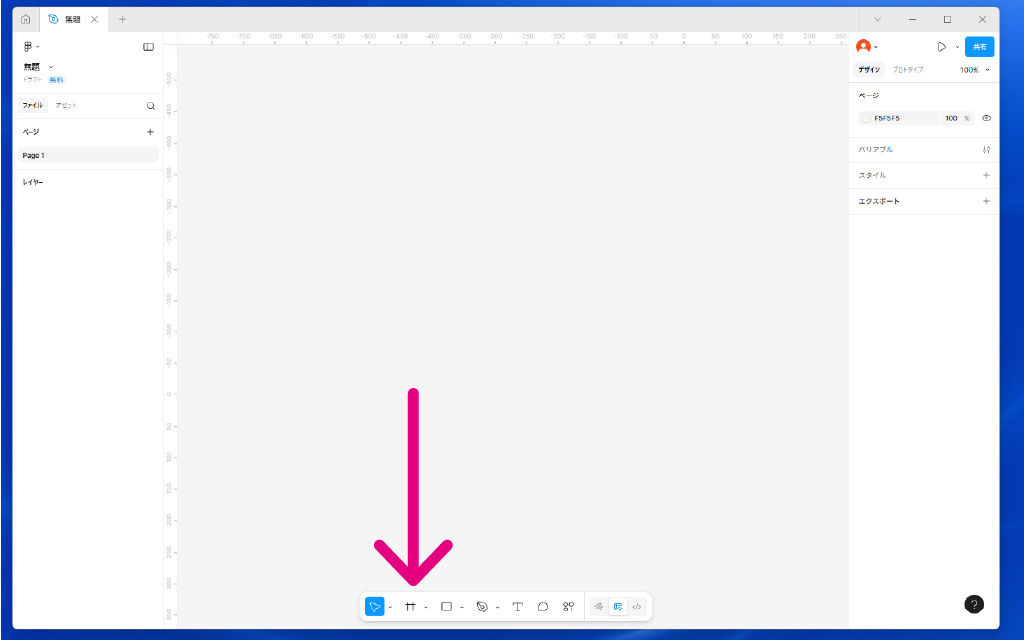 次は作業するスペースをつくりましょう。画面真ん中の何も置かれていないうすいグレー部分を「キャンバス」と言います。画面中央下にある矢印などが並んだツールバーの左から2つ目の「フレーム」をクリックしてください。