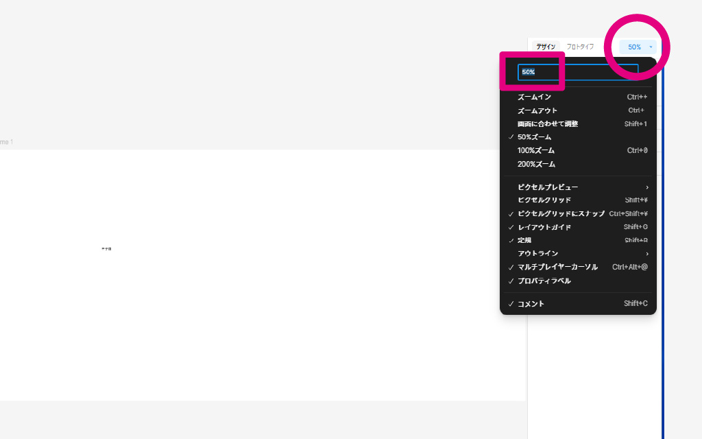 左ツールバーの最上部にある「50%」をクリックし100%など数値を入力します。