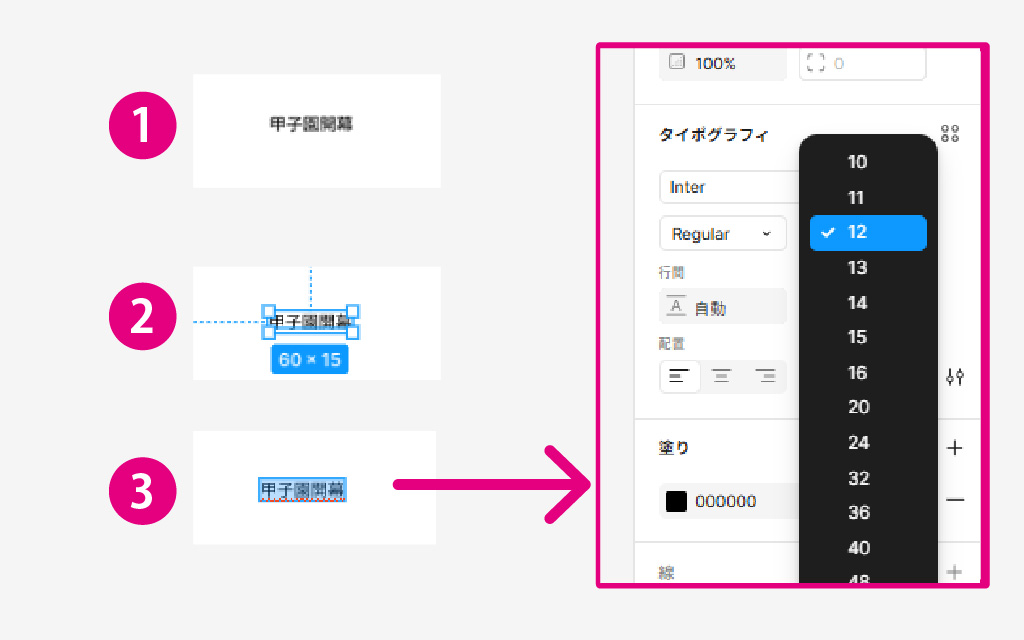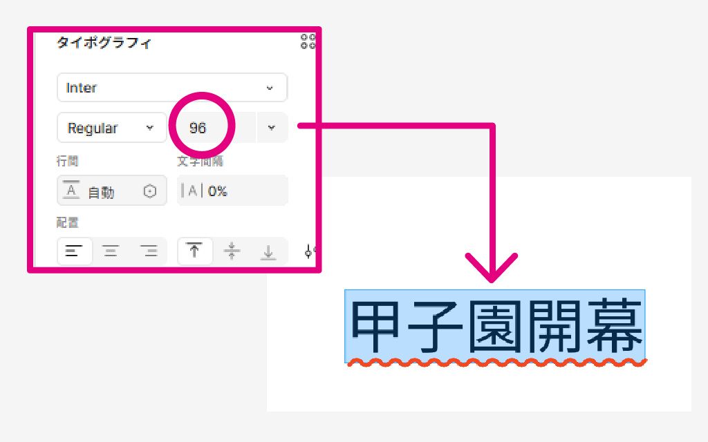左のツールバーにある「タイポグラフィ」にある「Inter」の下にある「12」がサイズをあらわす数値です。