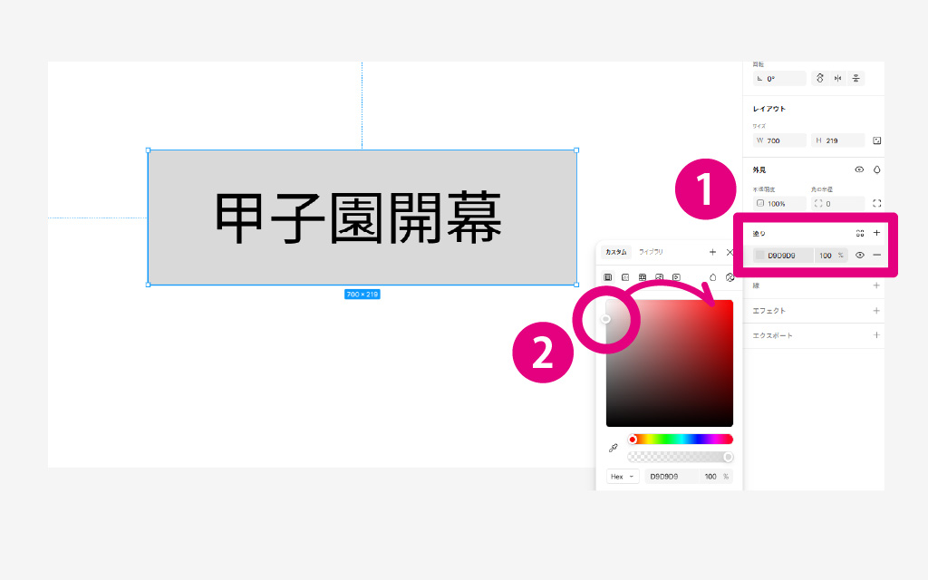 ついでに色も変えましょう。背景を選択したまま右のサイドバーにある「塗り」の下にある色の情報部分をクリックします。「D9D9D9」の左にあるグレーの四角を選択すると色が変えられるグラデーションのあるウインドウが表示されます。