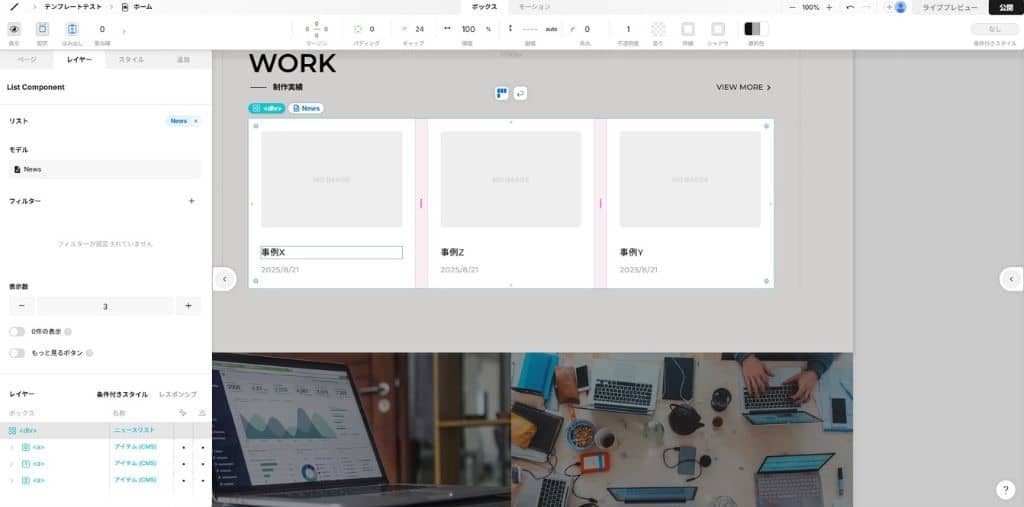しかも、複数のイメージ画像の間にテキストを入れる部分にいたっては、画像の位置の変え方がわからないという悲劇。どうやったら先ほどのキャプチャの位置から動かせるのでしょうか…。ノーコードだからといって直感的に操作できるわけではないようです。