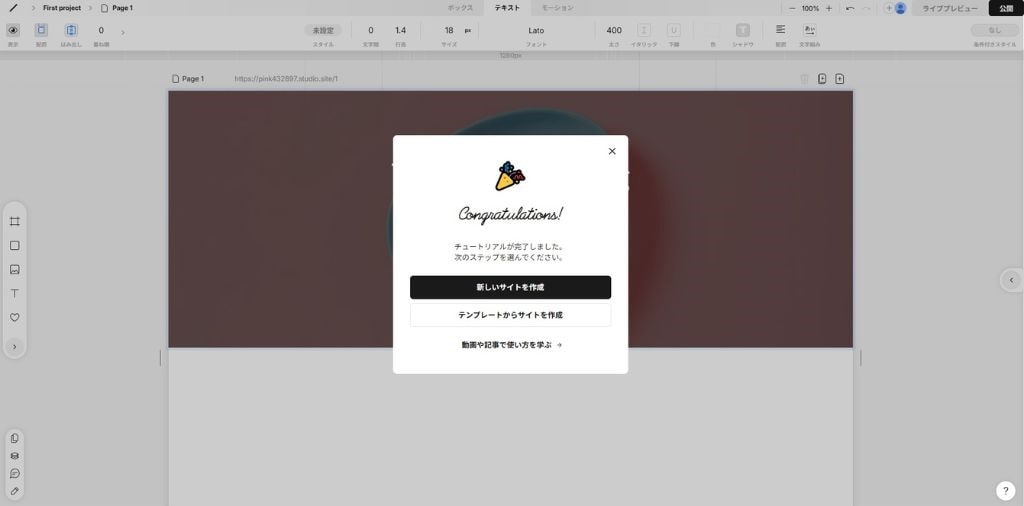 チュートリアルがすべて終わると、「新しいサイトを作成」か「テンプレートからサイトを作成」かの選択ができます。