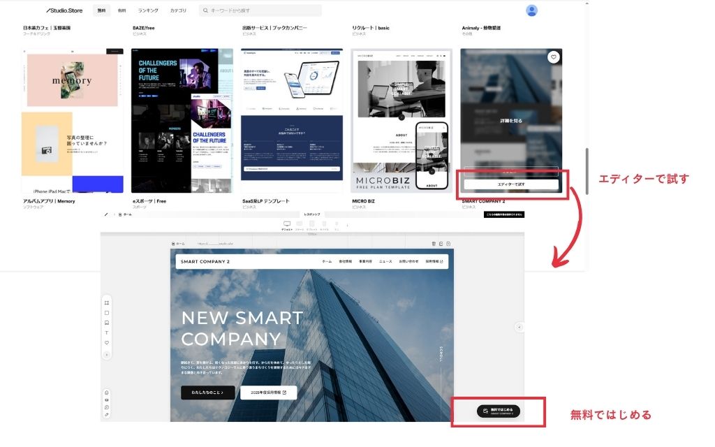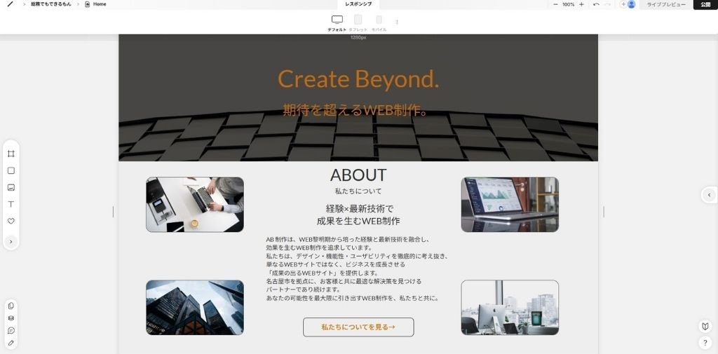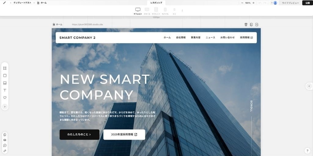 コーポレートサイトっぽいテンプレートを探し、「エディターで試す」を選択すると、編集画面が表示されます。ただし、この編集画面はサンプルなので、ここから編集することはできません。(わたしは勘違いしました)