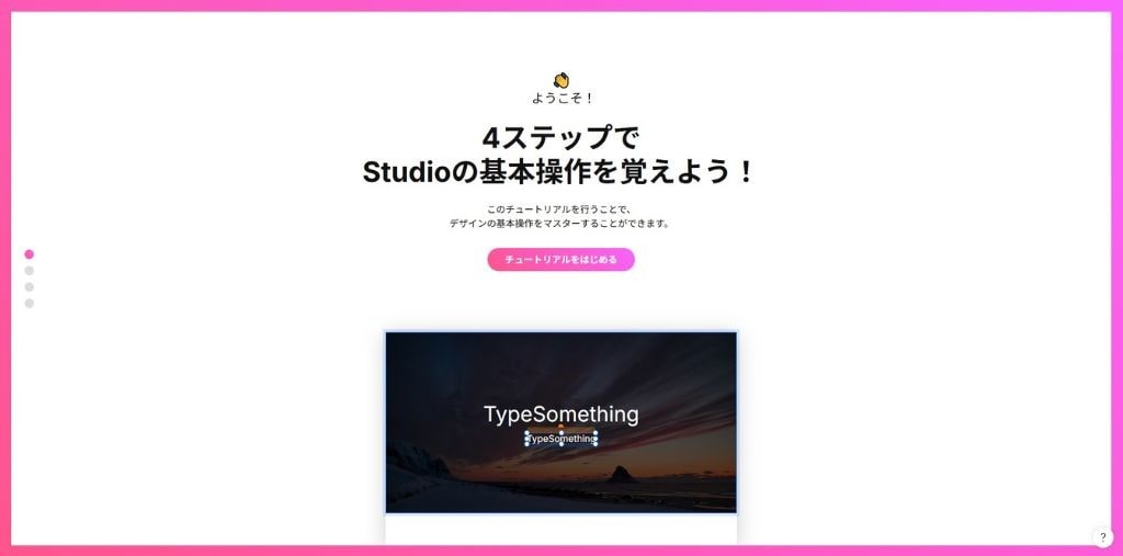 Studioの料金ですが、基本的な機能は無料で利用することができます。(有料のプランもいろいろあります)新規でユーザー登録をしたところ、最初にこんな画面が出てきました。