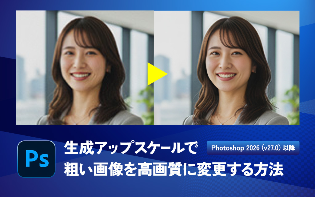 【 ※ 注意 ※ 】 生成アップスケールは Photoshop 2026(v27.0)以降 で使える新機能です。 それ以前のバージョンをお使いの場合は、メニューに表示されませんのでご注意ください。
