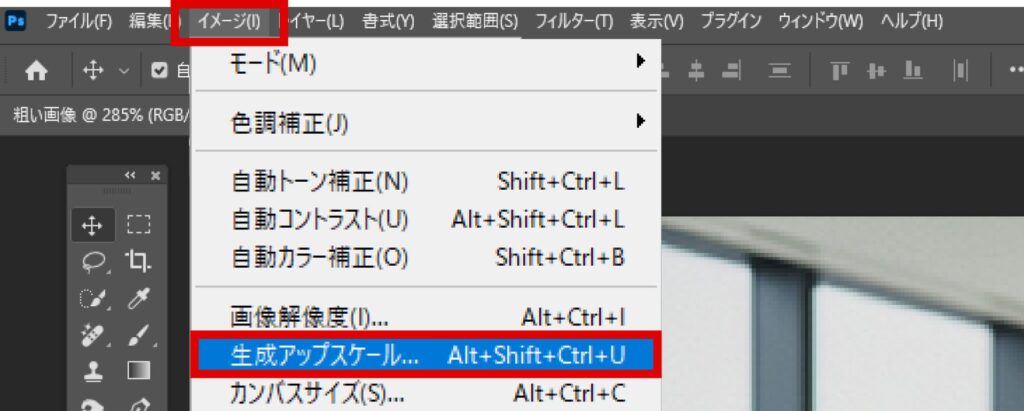 上部メニューの[イメージ]>[生成アップスケール]をクリックします。